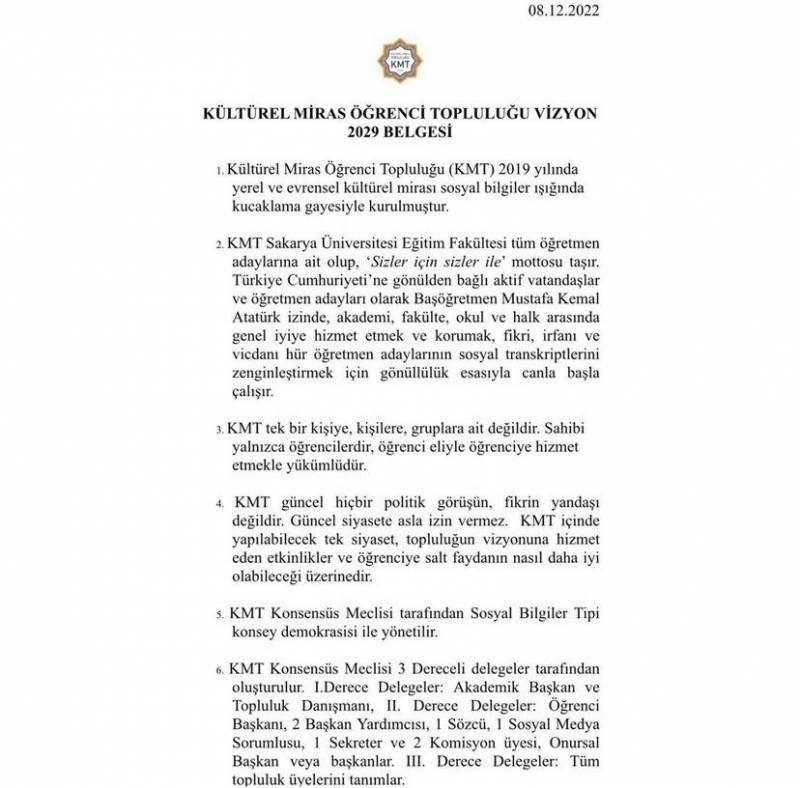 Kültürel Miras Öğrenci Topluluğumuzun yürütme merci Konsensüs Meclisi Vizyon 2029 buluşmasını gerçekleştirerek kritik bir adım attı. Daha sistematik, daha kurumsal, daha şeffaf, daha kucaklayıcı ama en çok da daha demokratik bir öğrenci topluluğu yaratabilmek adına Vizyon 2029 sözleşmesi Konsensüs Meclisi tarafından tartışmaya açılıp onaylandı. 14 maddede uzlaşan I.ve II. Delege meclis üyelerimiz imzalarıyla Kültürel Miras Öğrenci Topluluğunu doğrudan demokrasi ve öğrenciye öğrenci eliyle hizmet eden bir yapıya taşıyarak, yönetim şekli, onay ve veto süreci, kurallar bütünü, yaptırımlar, hedefler, beklentiler gelecek planları ve misyon olmak üzere birçok önemli konuyu somutlaştırıp sistemleştirdi.