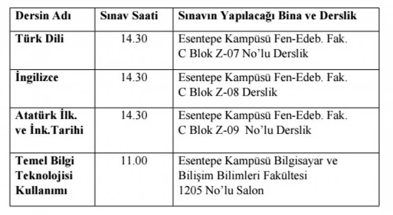 Sevgili arkadaşlar, 2016-2017 bahar yarıyılı üniversite zorunlu ortak derslerinin tek ders sınavları 2 Haziran 2017'de yapılacak olup, yer ve saat bilgileri ekte bilginize sunulmuştur.