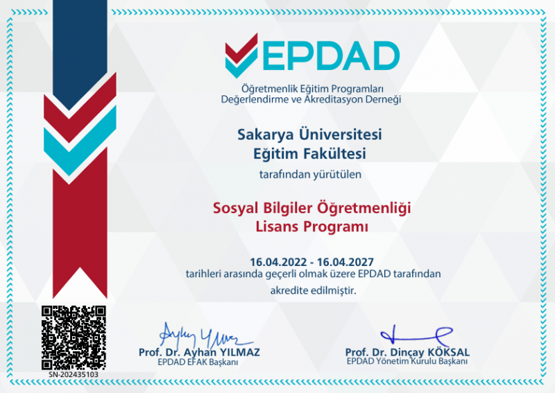 Bu kapsamda programımız Öğretmenlik Eğitimi Programları Değerlendirme ve Akteditasyon Derneği (EPDAD) tarafından 2027 yılının 16 Nisan gününe değin akredite olmuştur.